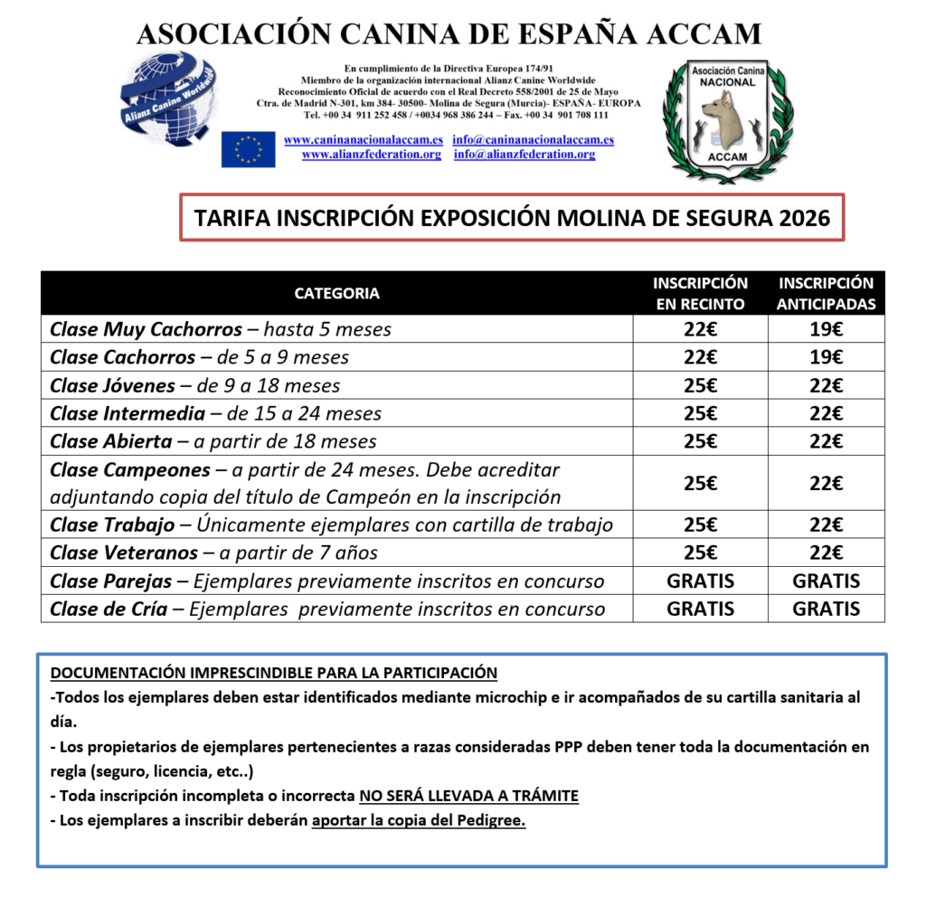 HORARIO INSCRIPCIONES PARA LA EXPOSICIÓN CANINA DE MORFOLOGÍA Y BELLEZA DEL DOMINGO 3 DE MAYO: